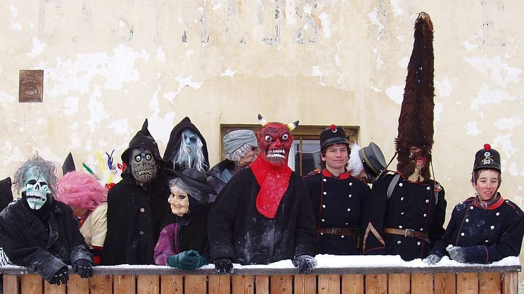 La cumpagnia da Chalandamarz culs trais mats ils plü vegls e la «bulavitra» (fotografia: mad).