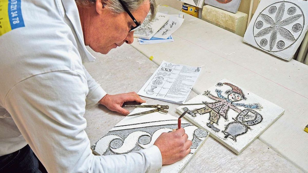 Josin Neuhäusler pro la lavur da sgrattar sgrafits. fotografia: mad