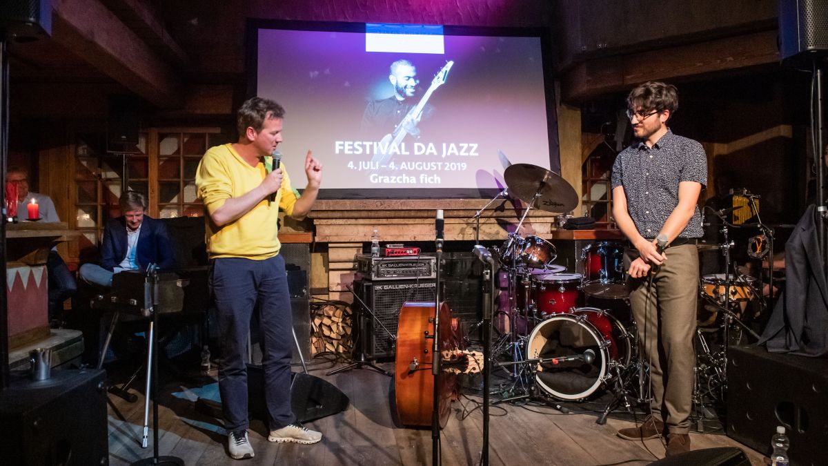 Der Gründer, Christian Jott Jenny, und der neue Leiter des Festival da Jazz, Yunus Durrer, präsentieren das Programm für den Sommer 2019. Das diesjährige Jazzfestival glänzt mit rund 25 Konzerten von verschiedenen Jazzmusikern. Foto: Giancarlo Cattaneo