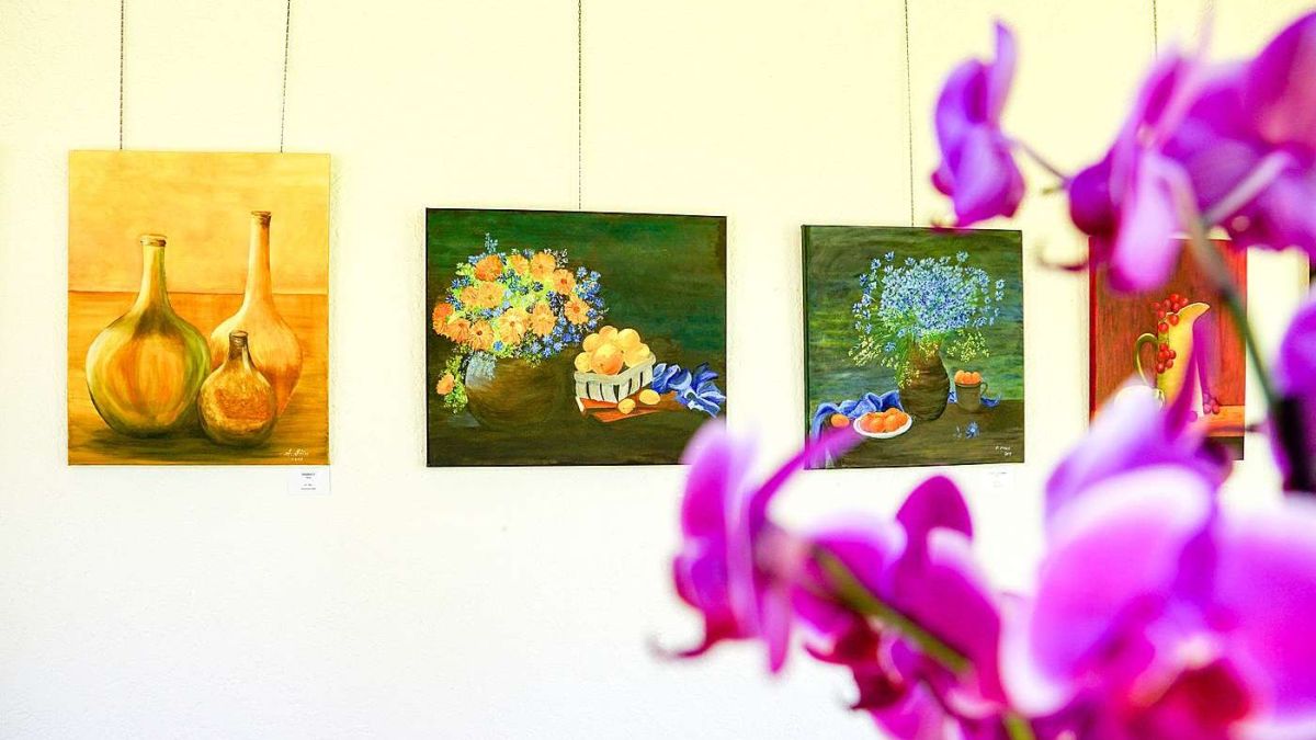 Blick in die farbenfrohe Bilderausstellung von sieben Künstlerinnen im Heilbadzentrum in St. Moritz, in welcher Blumensujets dominieren. Foto: Jon Duschletta