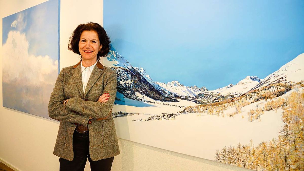 Die Zuozer Künstlerin und Ärztin Esther Rauch posiert in der Galerie La Suosta mit den Bildern «Wolken» und dem neuen Werk «Engadin bis Piz Badile» (vorne). Foto: Jon Duschletta