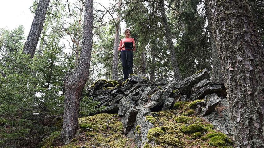 Ün’archeologa dal Servezzan Archeologic Grischun chi masüra ün dals mürs dal temp da fier sün Muotta da Clüs a Zernez (fotografia: SAG).