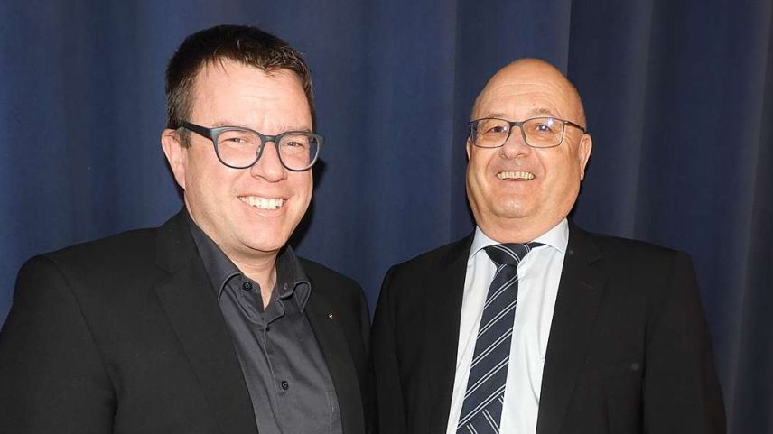 Michael Roth (a schnestra), il directer da las Ouvras Electricas Engiadina SA, insembel cul vicedirecter Roland Andri chi va in pensiun (fotografia: Annatina Filli).