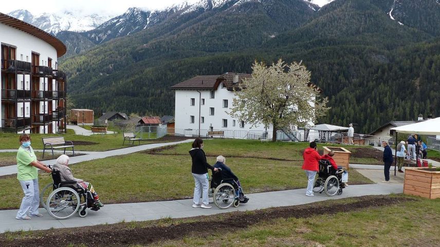 Las abitantas ed ils abitants da la dmura Chasa Puntota pon trar a nüz üna nouva sporta: Daspö marcurdi pona far üna spassegiada sün nouvas sendas sül prà suot la dmura (fotografia: Flurin Andry).