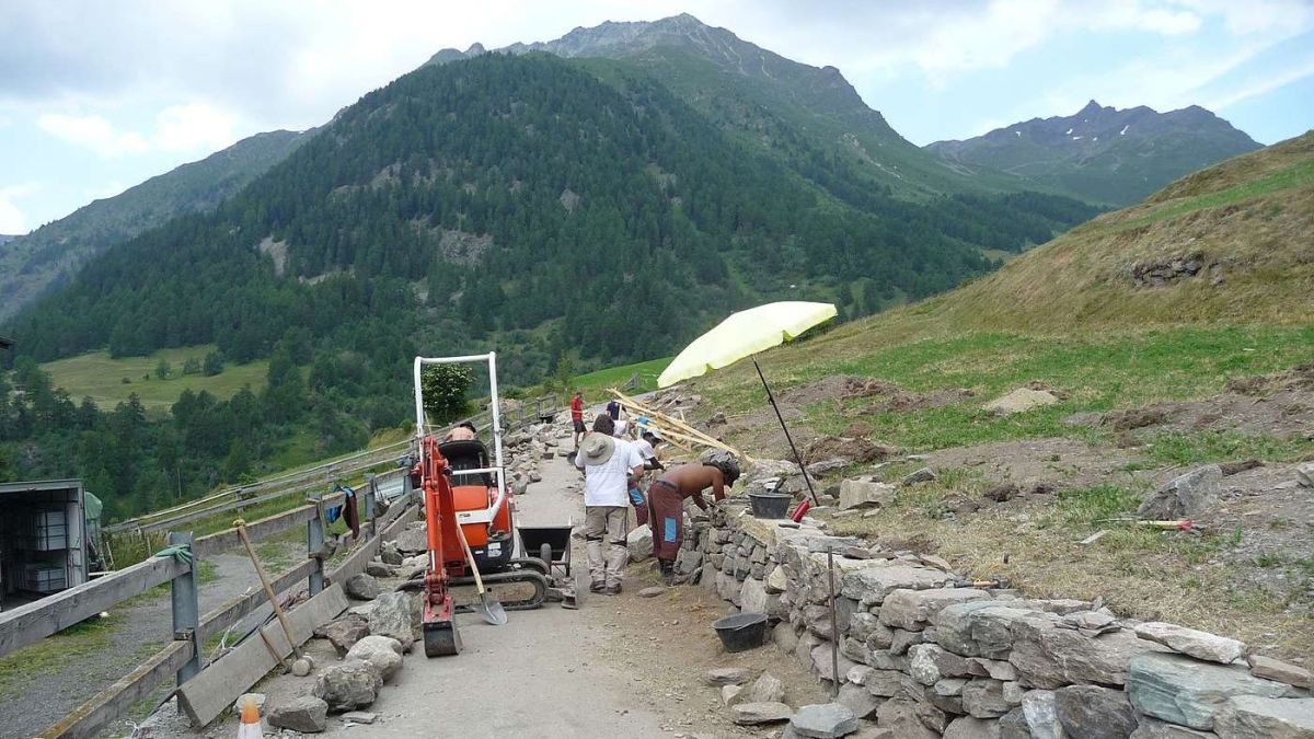 L’on passà han cumanzà ils homens da la Schweizer Stiftung für Umwelteinsatz a refar il mür sech lung la via da Tuoi (fotografia: Jachen Stuppan)