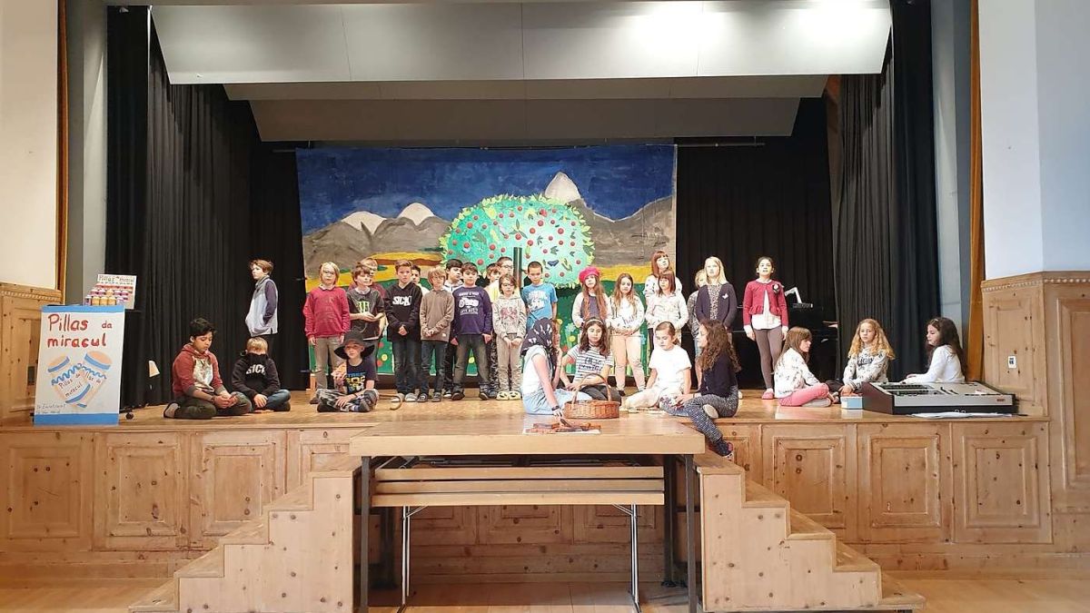 La terza e quarta classa da la scoula primara da Scuol ha preschantà il gö da chant Il comp(l)ot da maila.