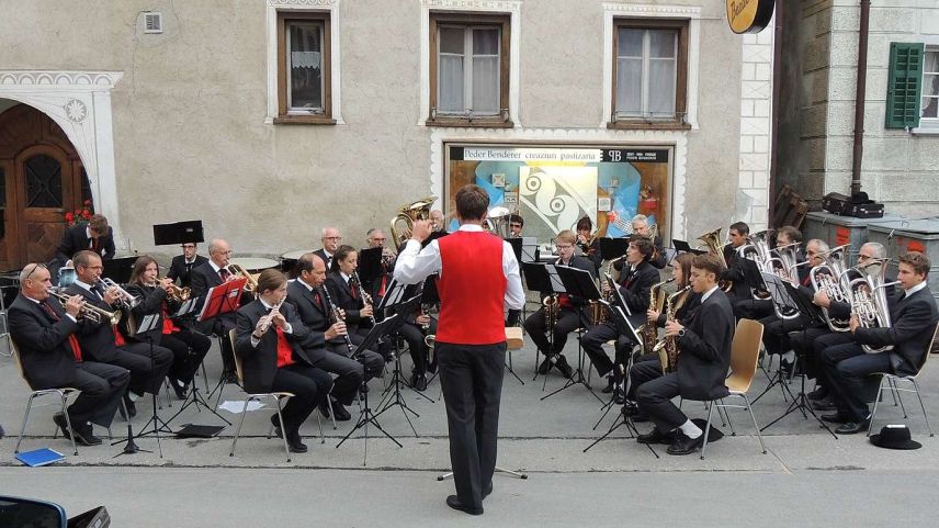 La Società da musica Sent cul dirigent Bastian Janett s’ha preschantada in occasiun dal concert sün Plaz (fotografia: Benedict Stecher).