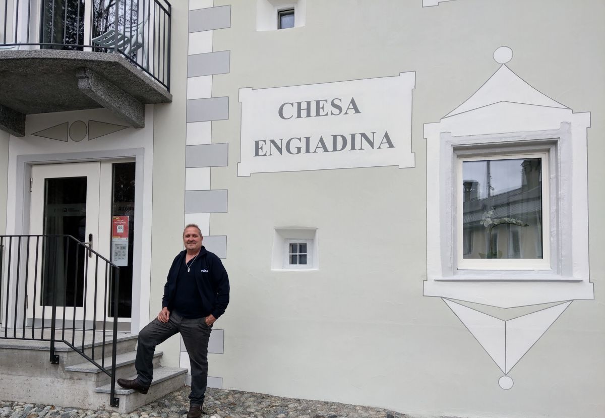 Gastgeber Beni Folie vor der erneuerten Reka-Ferienanlage Chesa Engiadina in Madulain. Foto: z. Vfg.