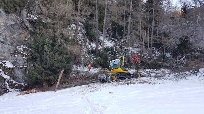 Ün collavuratur da l’uffizi forestal dal cumün da Val Müstair rumischa insembel cun ün’impraisa forestala la bos-cha terrada da la naiv. (fotografia: Jörg Clavadetscher).