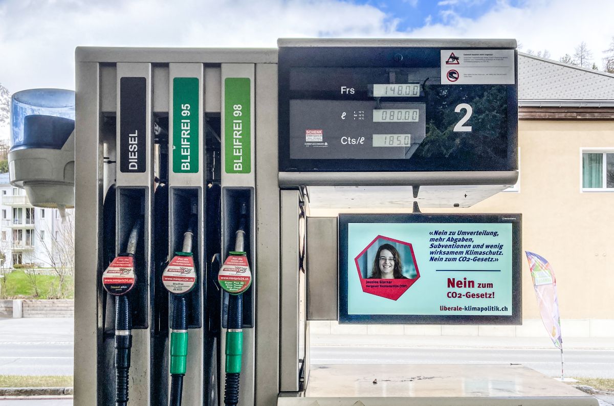 An der Tankstelle in St. Moritz Bad wird gegen das CO2-Gesetz mobilisiert - hier durch die Initiative «Nein zum CO2-Gesetz» Foto: Jon Duschletta