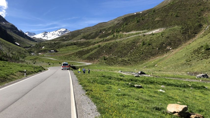 Eine Gruppe Radfahrer war um 9.30 Uhr von Nauders herkommend in Richtung Umbrailpass unterwegs. Bei der Örtlichkeit Alp Muraunzina fuhr der 54-jährige Velofahrer ganz rechts auf der Strasse. Der 56-jährige Autolenker, welcher als Begleitfahrer mit der Gruppe unterwegs war, nickte ein und touchierte den Radfahrer. Dieser stürzte und zog sich leichte Verletzungen zu. Der Autolenker fuhr noch etwa 40 Meter über das Wiesland bis er im Bach zum Stillstand kam. Der Leichtverletzte wurde zur Kontrolle mit der Ambulanz ins Spital nach Sta. Maria überführt.