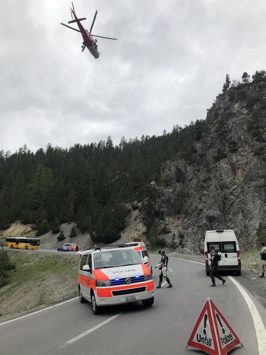 Der 42-jährige Motorradfahrer fuhr kurz nach 15 Uhr mit drei weiteren Kollegen vom Ofenpass in Richtung Zernez. Auf Höhe der Ortschaft Ova Spin verlor der deutsche Lenker die Kontrolle über sein Motorrad. In einer Linkskurve stürzte er rechtsseitig über die Fahrbahn und fiel circa 15 Meter einen Abhang herunter. Er kam samt Motorrad im Bachbett zum Stillstand. Seine Kollegen betreuten den Mann bis zum Eintreffen des Ambulanzteams Zernez. Die Rega barg den Verletzten mittels Windenaktion. Nach einer Zwischenladung wurde der verunfallte Motorradfahrer erstmedizinisch durch eine Notärztin betreut. Daraufhin wurde er ins Spital nach Scuol geflogen. Die Strasse musste während rund 30 Minuten komplett gesperrt werden. Gemeinsam mit der Staatsanwaltschaft ermittelt die Kantonspolizei Graubünden den genauen Unfallhergang.