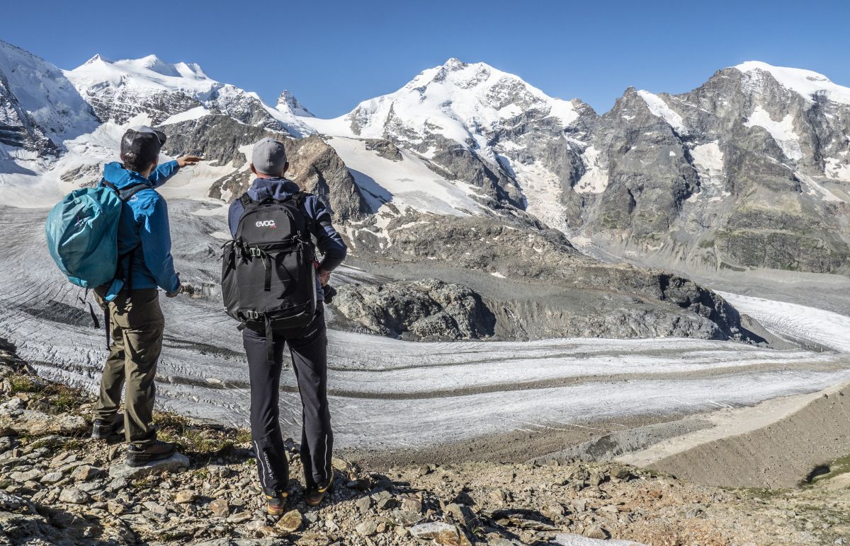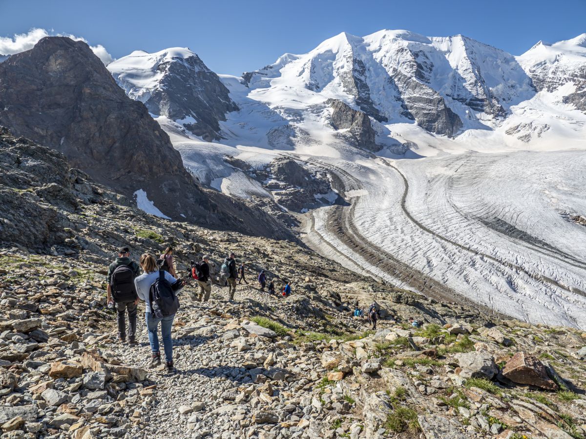 Die Gipfel des Bernina-Massivs vor Augen nähern sich die Wanderer auf dem neuen Rundweg dem Persgletscher.