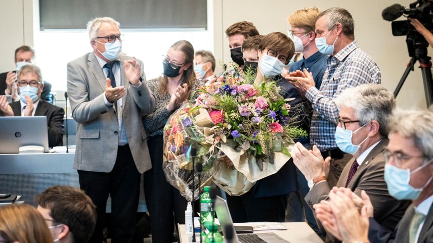 Grond applaus dal capo cumünal da Scuol, dals regents e grondcusgliers ed impustüt eir da la famiglia per la nouveletta presidenta dal Grond cussagl Aita Zanetti da Sent (fotografia: Daniela Derungs).