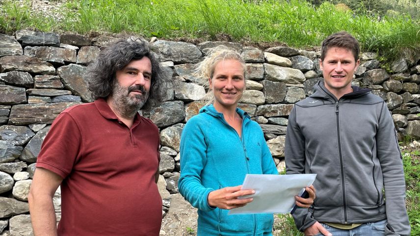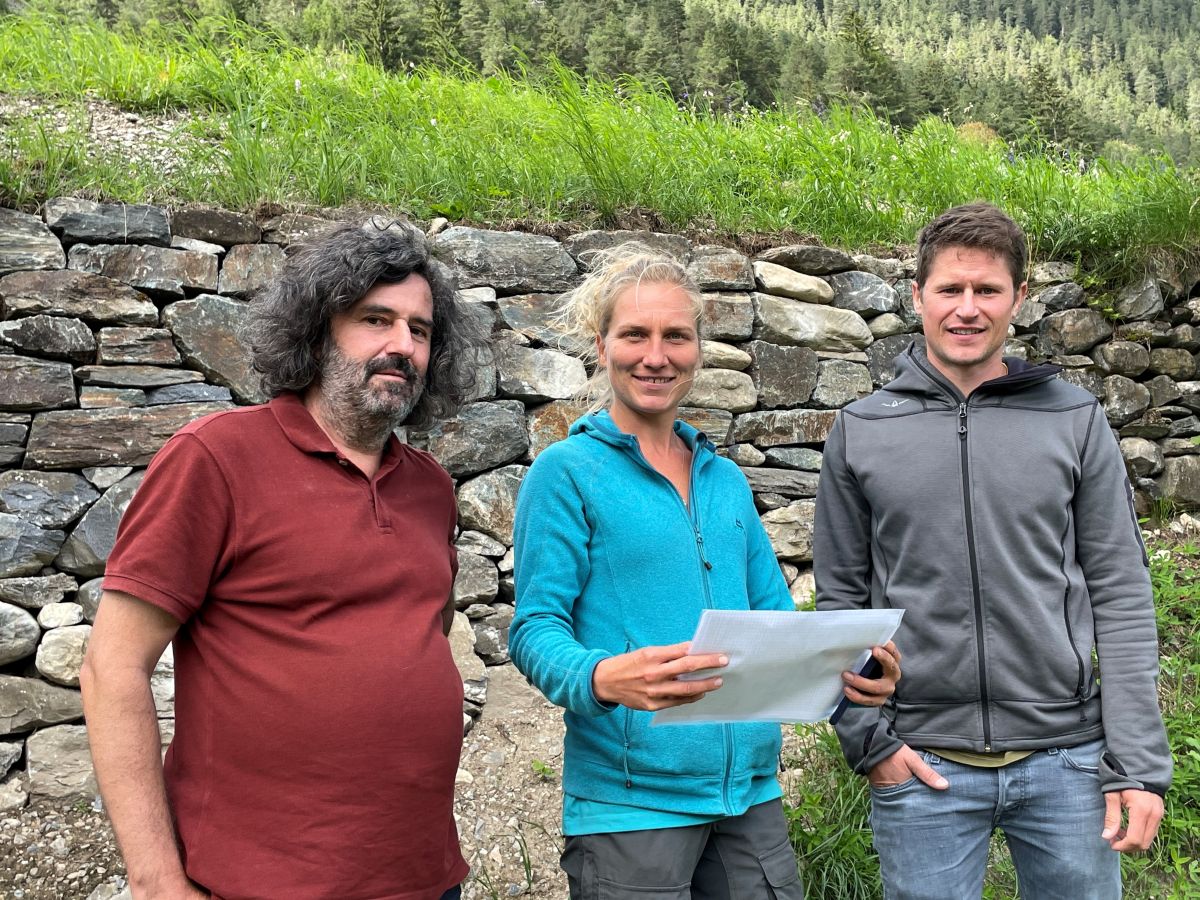 Johannes Florin, Lisa Zimmermann e Nicolas Ilg (da schnestra) davant il mür sech a Cha Noschas chi’d es gnü renovà (fotografia: Angelika Abderhalden).