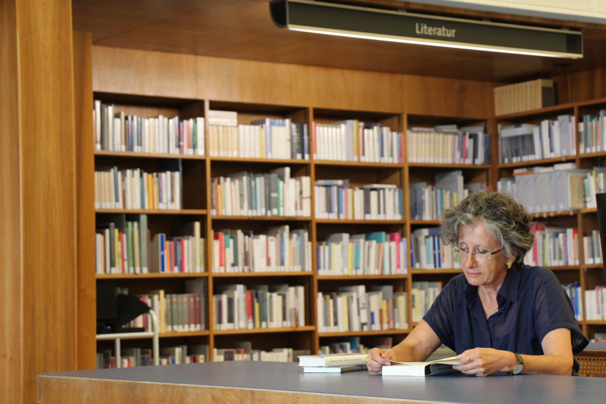 Annetta Ganzoni chi viva a Berna lavura vi da publicaziuns e vi dal mantegnimaint e la perscrutaziun da relaschs dad auturs ed auturas rumauntschas e taliaunas (fotografia: Gianna Duschletta).