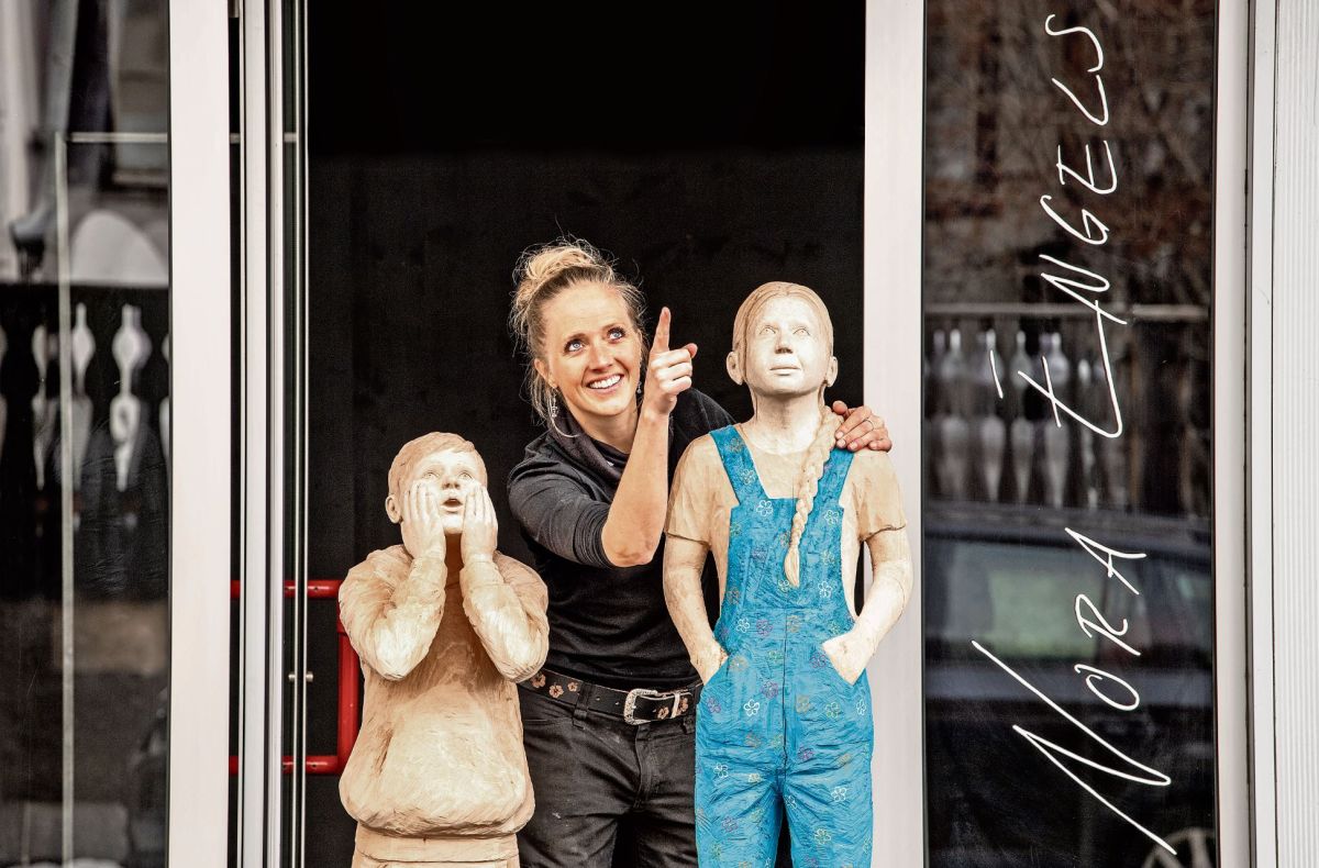 Nora Engels mit den zwei geschnitzten Kinderfiguren Leo und Lisa. Foto: z. Vfg.