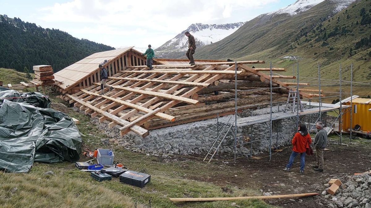 Illa construcziun in lain da l’Alp Tamangur Dadora s’haja integrà eir il lain existent (fotografia: Florian Conrad).
