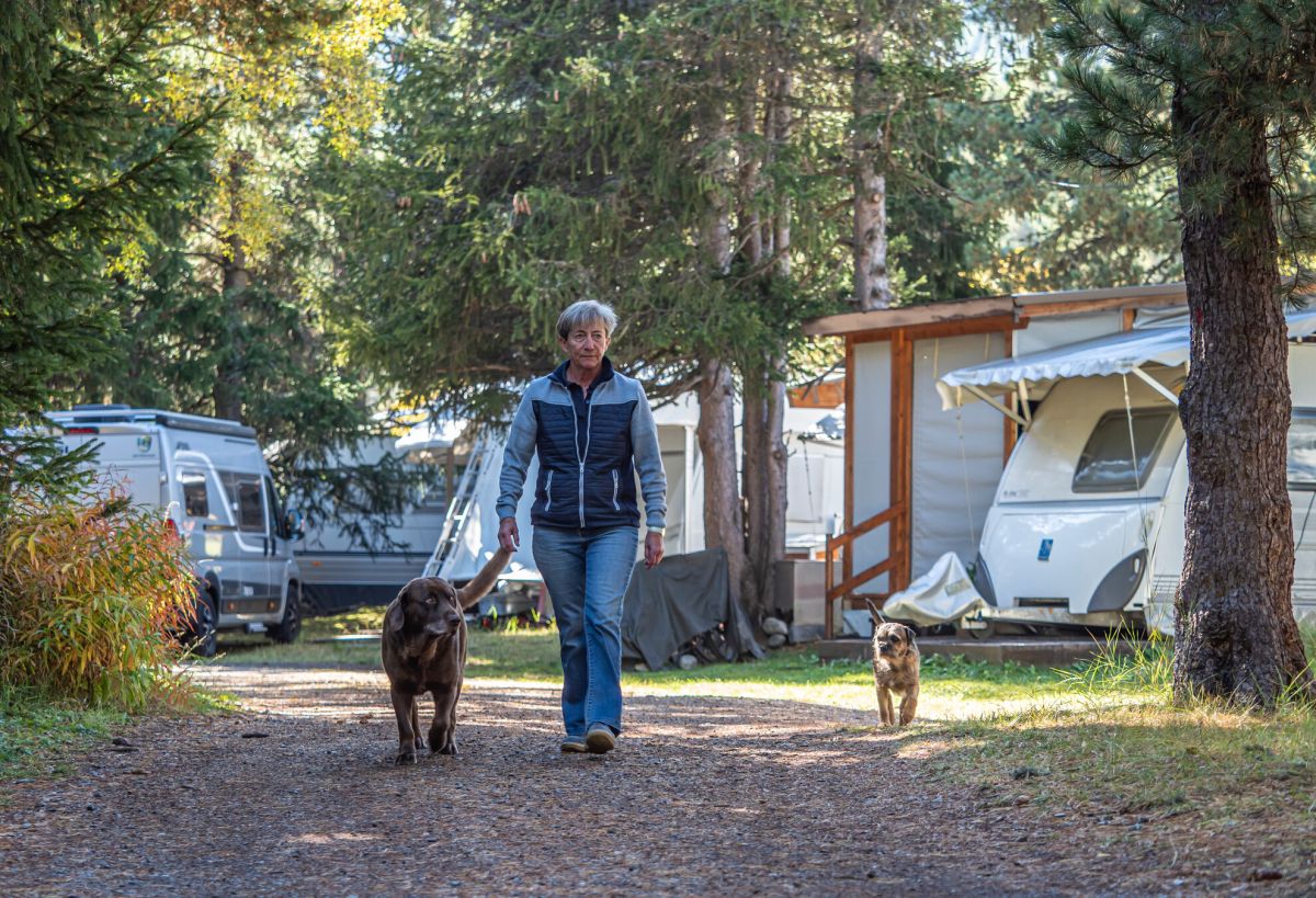 Die 64-jährige Camping-Wartin Brigitte Conte bei einem Rundgang mit Zambo und Gin auf «ihrem» TCS Campingplatz Samedan. Foto: Daniel Zaugg