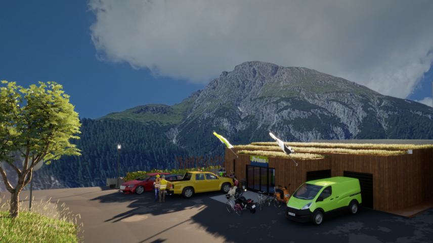 Il proget per la nouva butia a Ramosch sün plazza da scoula. Sper la butia dess eir gnir realisà ün cafè cun terrassa (fotografia: Bien GmbH).
