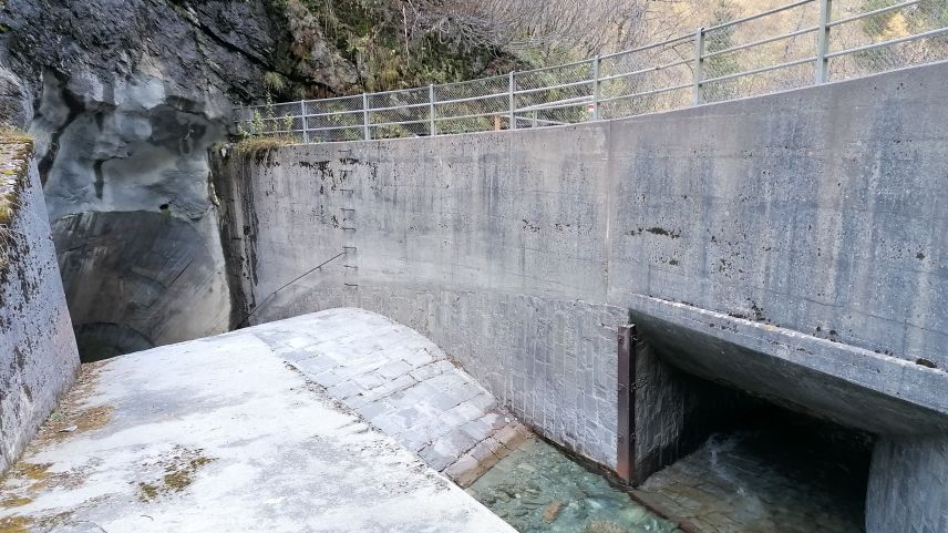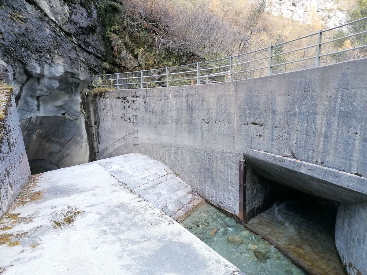 Abzweigung: Rechts fliesst die Fedacla in Richtung Fexer Schlucht und Sils Maria, links sieht man den Eingang in den Entlastungsstollen.