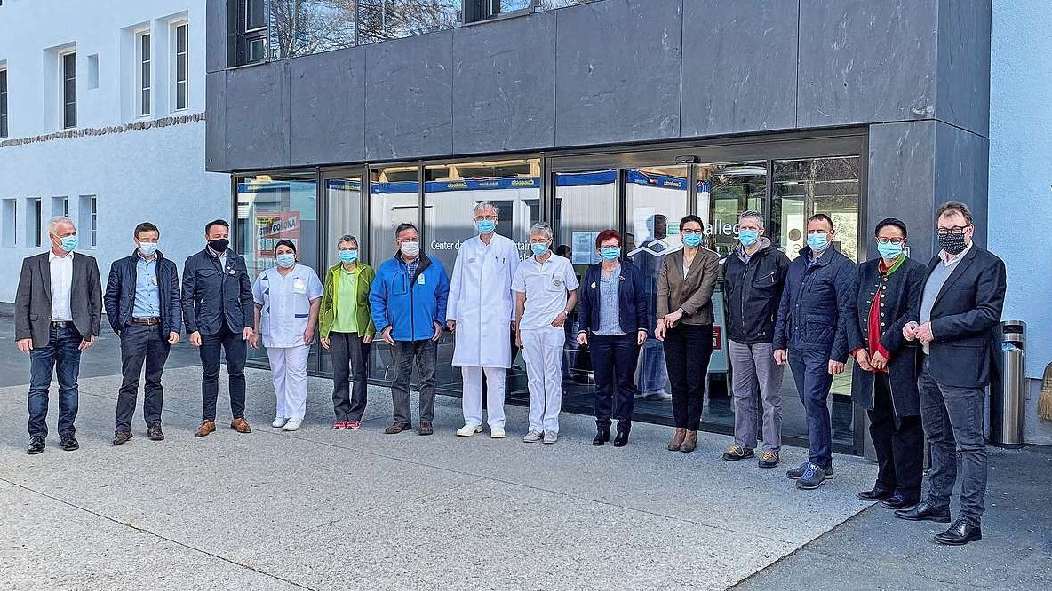 La delegaziun dal chantun insembel cun persunal dal Center da sandà Val Müstair (fotografia: Andri Netzer).