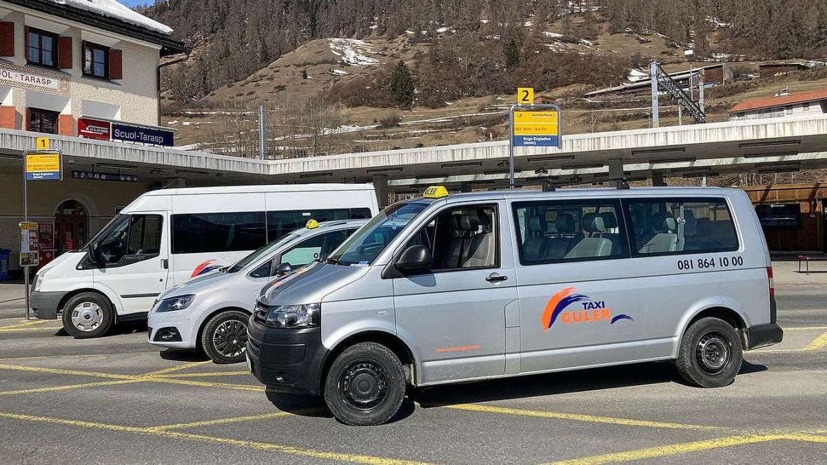 Divers passagers piglian il bus-taxi cur chi rivan la saira tard cul tren illa staziun da viafier da Scuol (fotografia: mad).