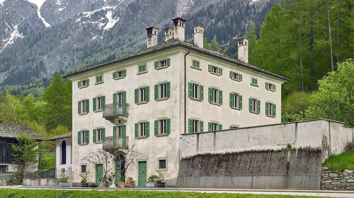 Die 1849 von Giovanni Battista Pedrazzini erbaute «Casa Pontisella» am Fuss der Sciora-Gruppe behielt auch nach dem Umbau Im Jahr 2017 durch Christoph Sauter Architekten ihr spätklassizistisches Gesicht. Foto: Jürg Zimmermann, Zürich