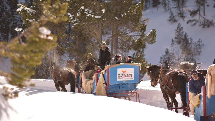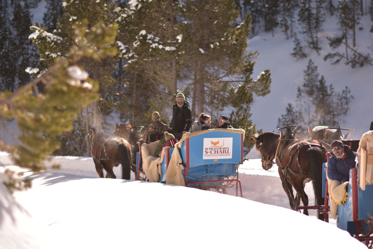 In Sastaglia wartet bereits der Pferdeschlitten auf die Winterfans. Sobald das Gepäck verstaut und die Gäste in warme Decken und Schafsfelle gepackt sind, beginnen die Pferde unruhig am Karabiner zu zerren. Peer arbeitet in S-charl mit acht Freibergern. Die freundlichen Zugpferde kennen die Strecke in- und auswendig. Täglich finden je nach Auslastung bis zu sechs Fahrten statt. In diesem Winter zählt Peer wieder Jon Pitschen, der bereits das vierte Jahr für ihn arbeitet und Martina Stauffer, die letzten Winter dazugestossen ist, zu seinen Angestellten.