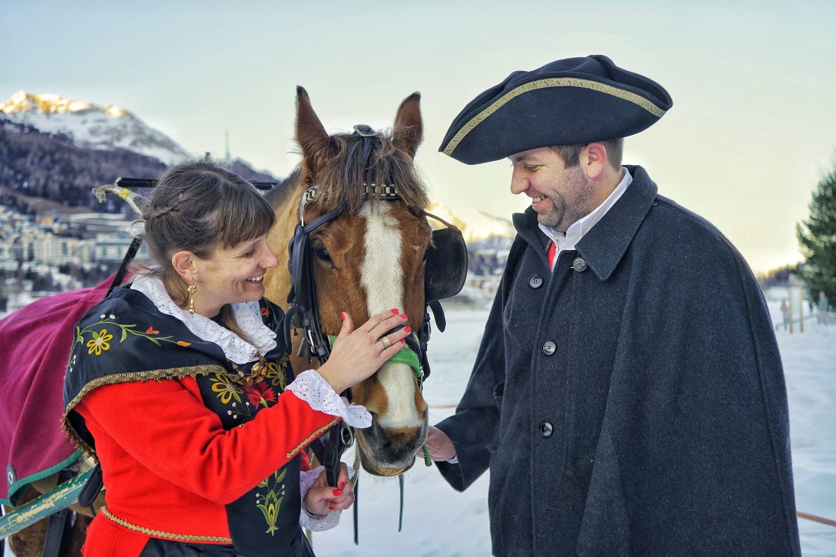 Um kurz nach halb zehn zog die 13-köpfige Gruppe inklusive Vorreiterin los. Die diesjährige Route führte über Oberalpina nach Salastrains, danach fuhren die einheimischen (und allesamt verheirateten) Paare auf ihren traditionellen Schlittins und bei strahlendem Sonnenschein auf dem Schellenursli-Weg über die Via Tinus nach St. Moritz Dorf und von dort weiter Richtung Celerina mit dem Ziel Restaurant La Terra 27 in Punt Muragl, wo sich die Gruppe zum Mittagessen und zum Apéro traf und auch die Pferde getränkt und gefüttert wurden. Danach machte sich die heitere und gut gelaunte Schlitteda-Gesellschaft auf den Rückweg, welcher durch den Stazerwald und über den zugefrorenen St. Moritzersee führt. Beim Ritt übers Eis zeigten sich die sechs Gespanne und die Vorreiterin ausser Rand und Band, die Rösser drehten richtig auf: Mit einem Affenzahn preschte die Kolonne los. Schon von weitem konnte man das Schellen der Glocken und das Jauchzen und Jubeln der Passagiere hören. «Ueeeela,» tönte es laut. Etliche Spaziergänger unterbrachen ihren Schritt, um ein Foto von der wagemutigen Festgesellschaft zu schiessen. Mit dem Schlittengespann über das Eis zu flitzen ist ein nicht ganz ungefährliches Unterfangen, besonders für jene, die nur wenig Erfahrung mit Pferden haben – das sieht auch Jana Marchesi-Blättler so, die Organisatorin des Anlasses. «Wir sind immer froh, wenn alle heil wieder ankommen.» Während das Fest früher dazu diente, Unverheiratete unter die Haube zu bringen, ist der Zweck heute ein etwas anderer: Die Tradition soll bewahrt werden und mit Freunden eine gute Zeit verbracht werden. Hinzu kommt, dass alle Pärchen, die am Samstag mitfuhren, bereits verheiratet sind. Doch das tut der Freude keinen Abbruch, im Gegenteil. Claudio und Daniela Willy aus Sils sind bereits zum achten Mal dabei. Und Daniela ist erneut hellauf begeistert, als sie neben der Polowiese vom Schlitten steigt und die dampfenden Pferde mit Futter und Wasser versorgen kann. «Das ist immer der schönste Tag im Jahr! Absolut genial, wie wir heute über den See geflitzt sind, das haben wir schon Jahre nicht mehr gemacht», lautete ihr erstes, wohl noch adrenalingeladenes Fazit.
