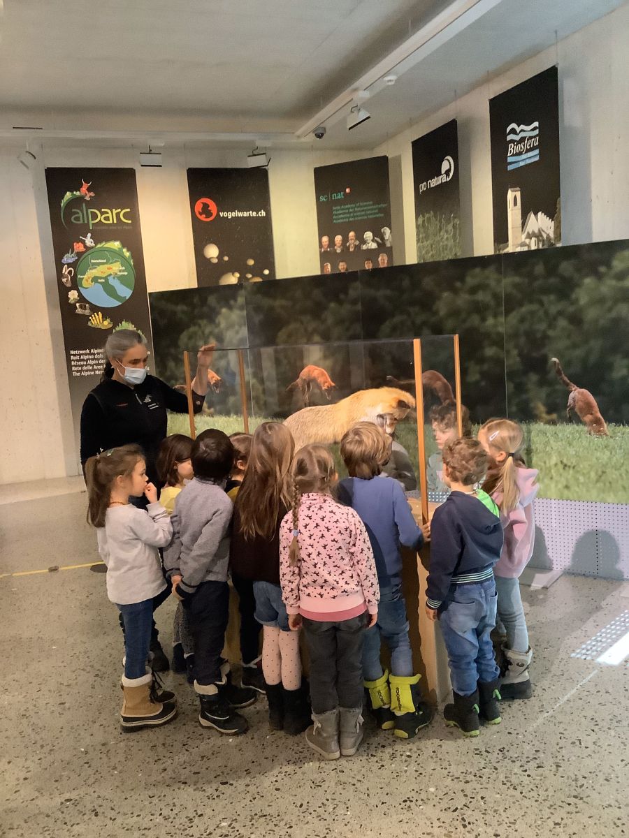 Anna Mathis, dal Parc Naziunal Svizzer, declera als scolarins d’Ardez sco cha la vuolp va a chatscha (fotografia: mad).