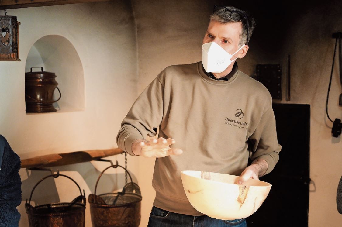 Andreas Gerig präsentiert seine Arvenschüssel.