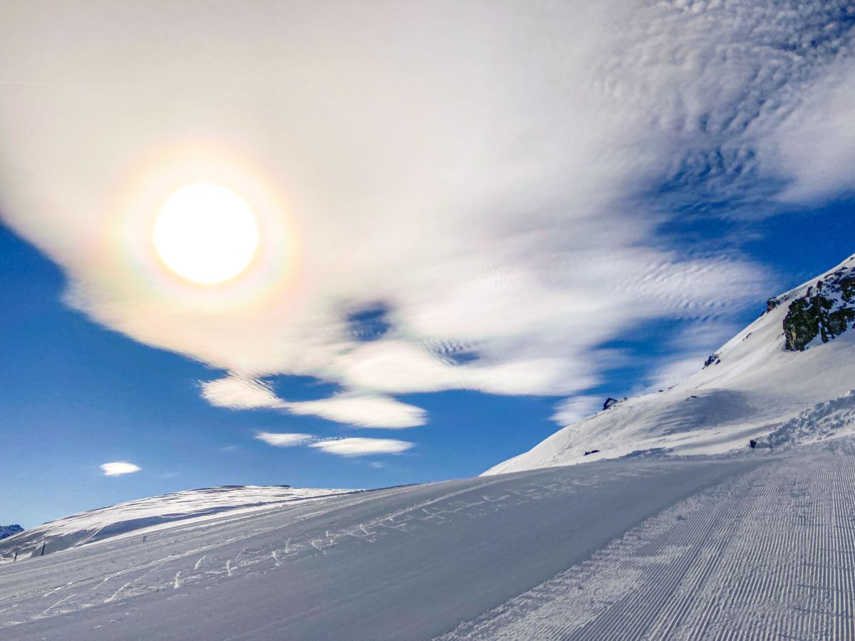 Manchmal lohnt es sich, den Blick von der Skipiste – hier im Gebiet Scuol Ftan – zu heben und sich dessen gewahr zu werden, was sich im Rücken abspielt: Wolkengebilde.