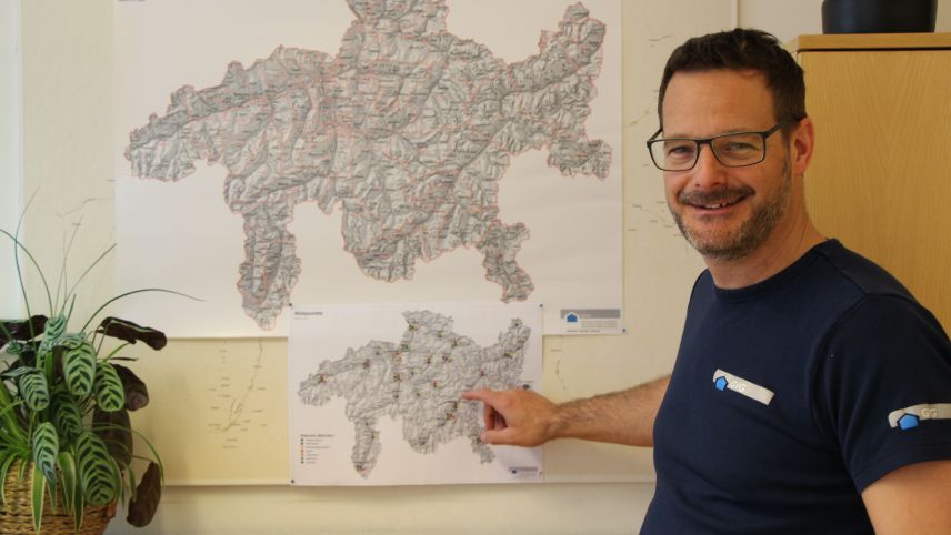 Conradin Caduff erklärt das Feuerwehrstützkonzept. Grüne Punkte zeigen Stützpunkte auf, an denen Material zur Löschung von Waldbränden gelagert ist. Dieses kann von den Stützpunkten zur Einsatzstelle geflogen werden.