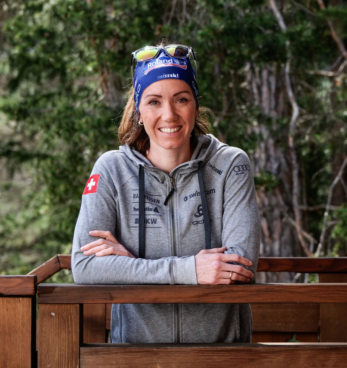 Selina Gasparin ist auch drei Wochen nach ihrem Rücktritt noch durch und durch Spitzensportlerin. Beim Fototermin denkt sie zu allererst an ihre treuen Unterstützer: «Das bin ich meinen langjährigen Sponsoren schuldig.» Foto: Jon Duschletta