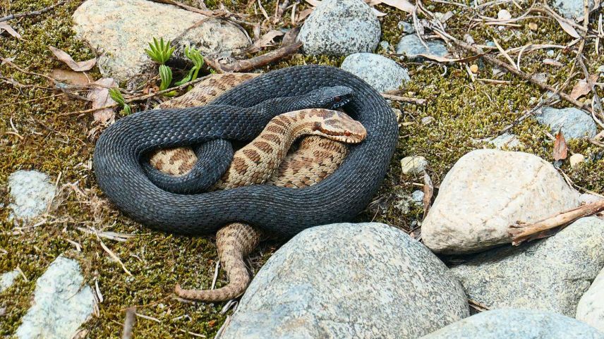 Aktuell ist in höheren Lagen die Paarungszeit der Kreuzottern im Gange. So auch im Engadin, einer eigentlichen Hochburg dieser kleinen, heimischen Giftschlange Vipera berus mit ihrem auffälligen Zickzackmuster, den typischen, senkrecht geschlitzten Pupillen, gekielten Schuppen und den zwei, jeweils drei bis fünf Millimeter langen Giftzähnen im Oberkiefer. Auf dem Bild ist ein eher seltenes schwarzes Kreuzottermännchen – ein Schwärzling – zu sehen, wie es ein hellbraunes Weibchen hütet. Diese Partnerbewachung, in der Fachsprache «mate guarding» genannt, ist als Bewachung eines Weibchens durch ein Männchen vor, während oder nach der Kopulation bei verschiedenen Spezies bekannt und gilt als natürliche Anpassung an die Spermienkonkurrenz. Männliche Bachflohkrebse gehen sogar so weit, dass sie Weibchen schon vor ihrer Geschlechtsreife bewachen, und auch der Mensch kennt in verschiedenen Kulturen solche Bewachungsmuster.