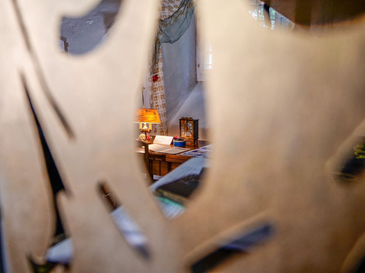 Blick durch eine Dekorationsschablone auf Exponate der Ausstellung «Die Uhr» im Kulturarchiv Oberengadin in Samedan. Foto: Jon Duschletta