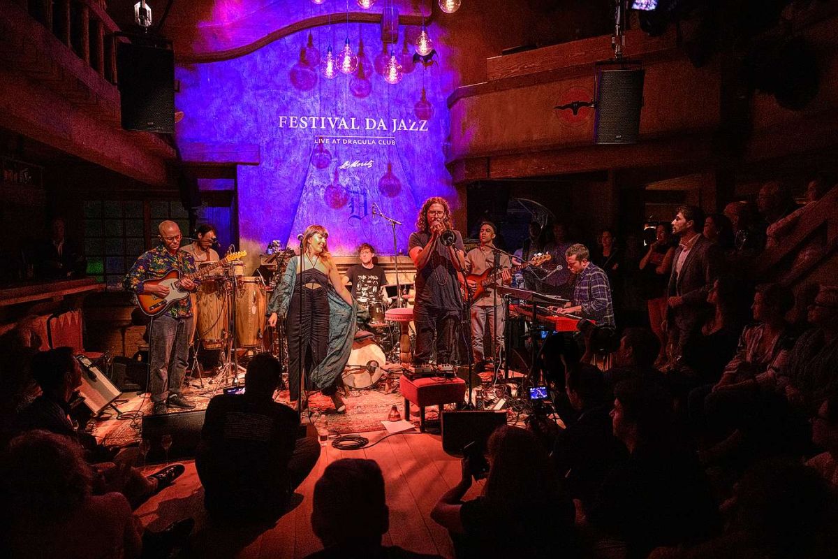Und ja, neben Ansprachen, anregenden Gesprächen, Wein und Häppchen gab es an der Opening Night vom Donnerstag selbstverständlich auch Musik. Der Bigband Nubian Twist, aus Platzgründen etwas geschrumpft, aber nicht weniger kraftvoll, kam die Ehre zu, das Festival da Jazz musikalisch offiziell zu eröffnen. Am Tag des Rücktritts vom britischen Premier Boris Johnson zeigten die Musikerinnen und Musiker aus Leeds/London, warum sie in ihrem Heimatland auch als Vertreter der Nu-Jazz-Szene gefeiert werden. Nubian Twist legte los, als ob es kein Morgen gäbe. Jazz, Afrobeat, Soul, Latin – die Band kann in keine Schublade gesteckt werden, zu vielfältig ihr musikalischer Stilmix.