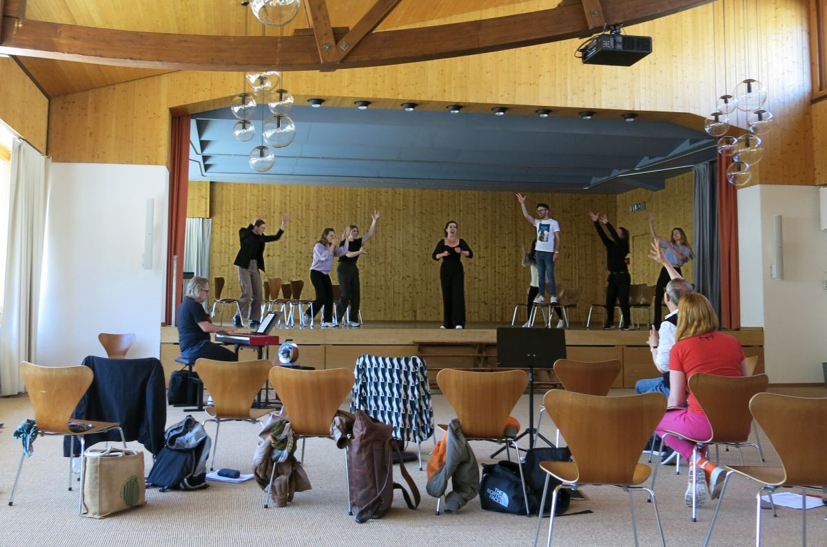Es ist 11.00 Uhr. Nach der Yogastunde finden sich die Teilnehmenden in der Aula des Schulhauses zum Einsingen mit Edward Hoepelman ein. Der Holländer ist ebenfalls Teil des dreiköpfigen Leitungsteams. Nach einer halben Stunde klassischer Stimmübungen erreichen die Sängerinnen und Sänger eine Stimmhöhe und ein Volumen, welches das Trommelfell beinahe zum Platzen bringt. Eine Gruppe arbeitet nun mit Gil Mehmert szenisch, während die andere Gruppe Gesangsunterricht geniesst.