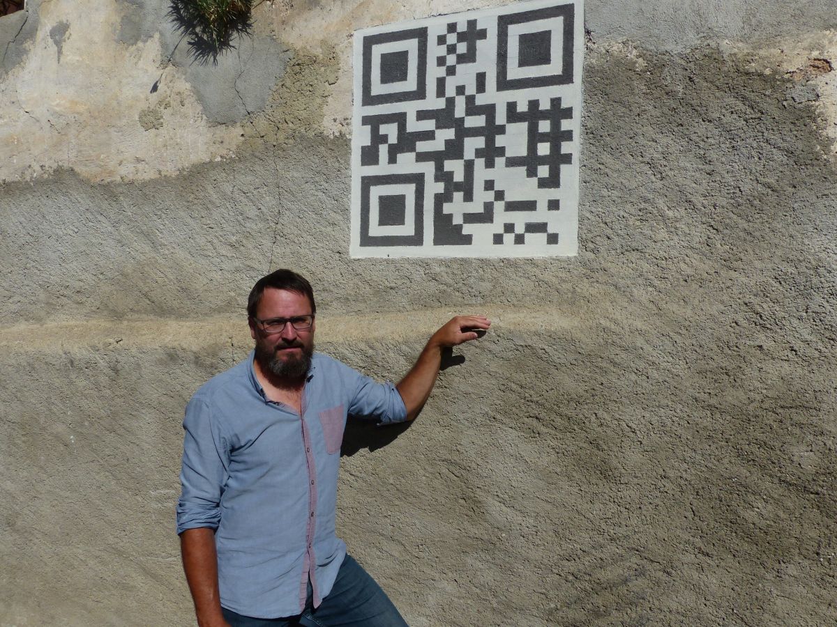 Curdin Tones davat sia chasa a Tschlin chi ha sü in fuorma da sgrafit ün QR-Code (fotografia: Flurin Andry).
