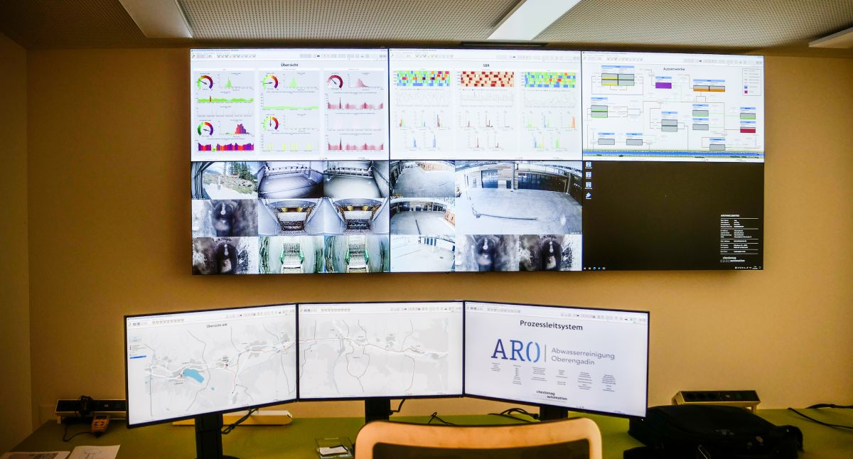 Blick auf die Überwachungs- und Steuerungsmonitore im Kontrollzentrum der ARA Oberengadin. Foto: Jon Duschletta