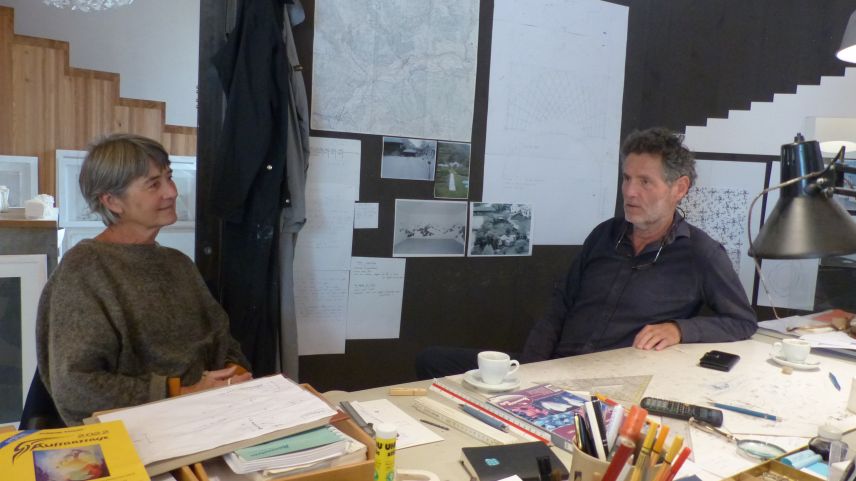 Madlaina Lys e Flurin Bischoff vi da la gronda maisa in l’atelier (fotogafia: Flurin Andry).