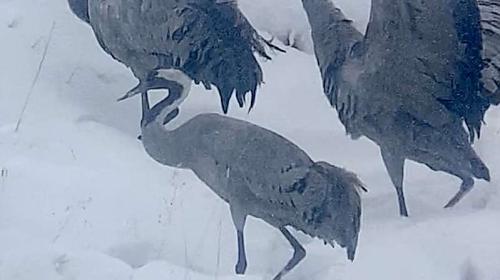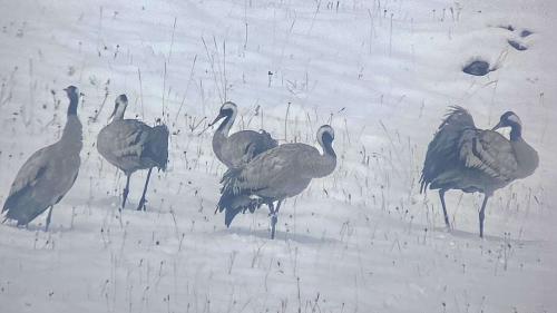 Im Neuschnee stocherten sie mit ihren langen Schnäbeln und bewegten sich langsam zu Fuss hangaufwärts. Kurz nach Mittag, als sich die letzten Wolken auflösten, reckten die Kraniche synchron ihre Hälse, als wollten sie ihre Bereitschaft zum Abflug signalisieren.