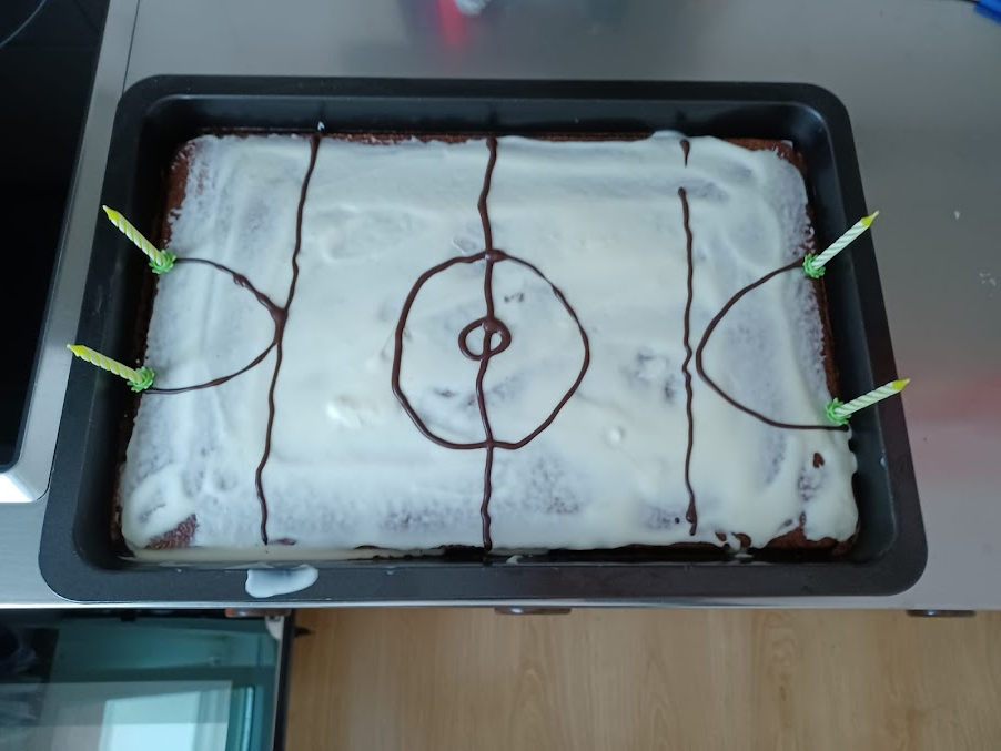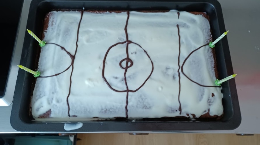 - Kuchen abkühlen lassen. Mit Zucker- und Schokoladenguss verzieren.