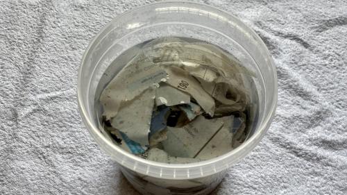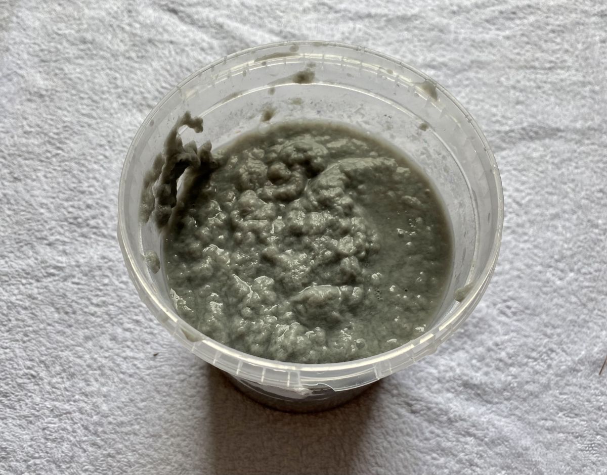 2. Püriere die Pulpe mit dem Pürierstab bis ein dicker Brei entsteht und keine Papierschnipsel mehr zu sehen sind.