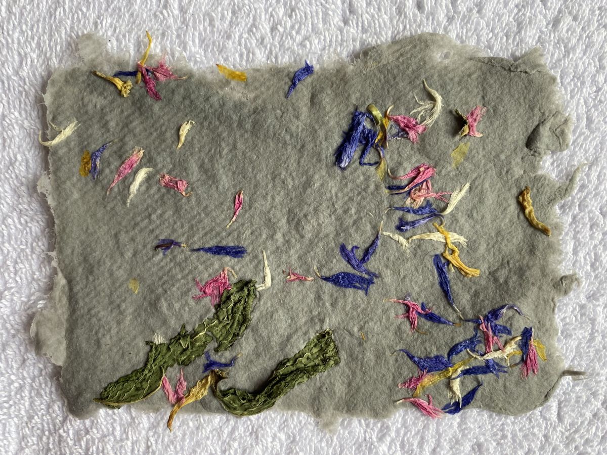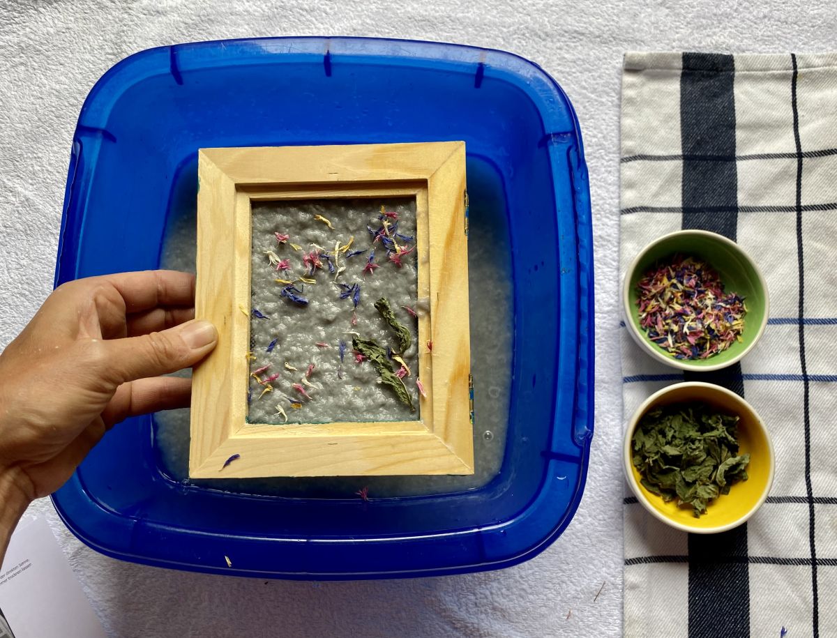 6. Wenn du dein Papier verzieren möchtest, ist jetzt der richtige Moment: Lege zum Beispiel gepresste Blüten oder alte Kräuter auf die abgeschöpfte Pulpe im Schöpfrahmen.