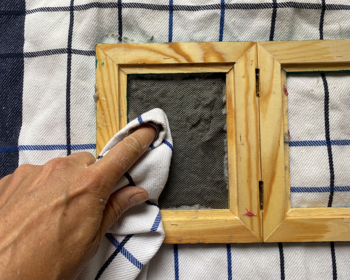 Schöpfrahmen gibt es zwar zu kaufen, nachhaltiger ist es aber, wenn du den Rahmen einfach selber machst. Am einfachsten geht das, indem du einen alten Holzbilderrahmen verwendest und ein feines Netz darüber spannst. Als Netz eignen sich zum Beispiel Reste eines Fliegengitters, eine alte Stumpfhose oder ein anderes feine Netz. Nimm die obere Hälfte des Bilderrahmens ab und befestige das Netz auf die Innenseite der unteren Hälfte, sodass es zwischen dem Bilderrahmen eingespannt ist.