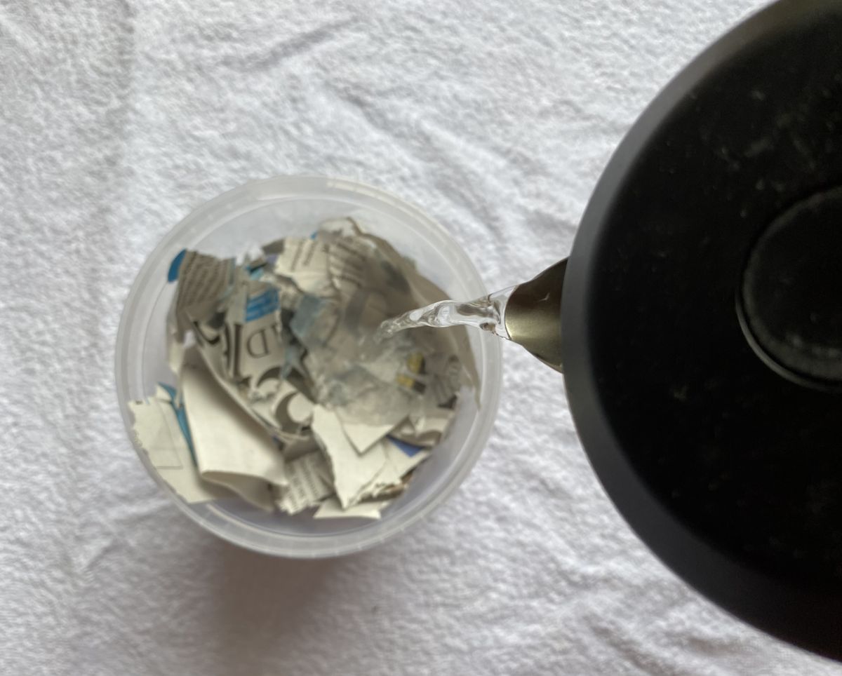 1. Zuerst musst du die Pulpe vorbereiten. Das ist ein Papier-Wasser-Brei. Zerreisse dafür ca. drei Doppelbögen Zeitungspapier in kleine Stücke und übergiesse sie mit warmem bis heissem Wasser (etwa ein bis zwei Liter). Für farbiges Papier kannst du farbiges Altpapier verwenden oder Wasserfarbe unterrühren.