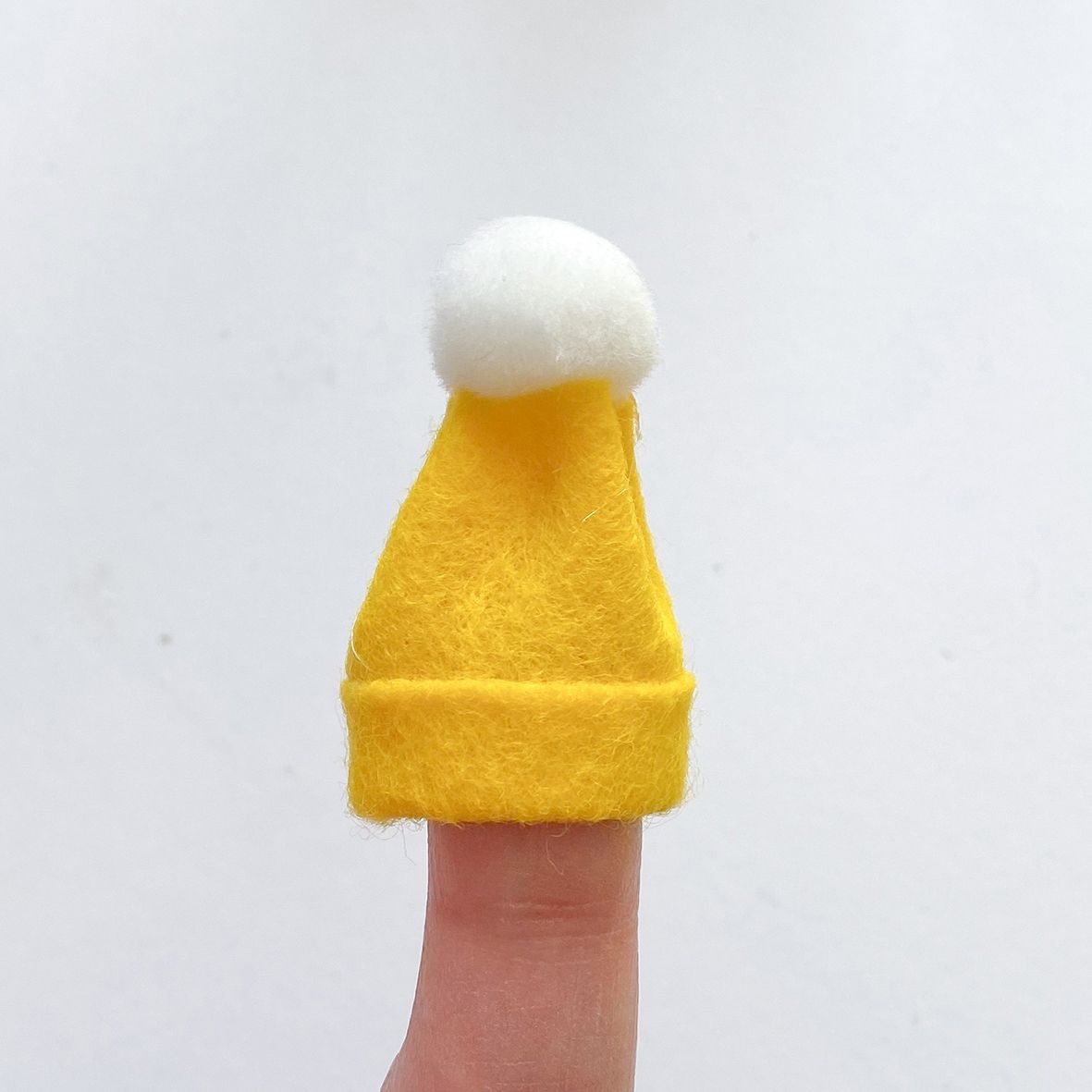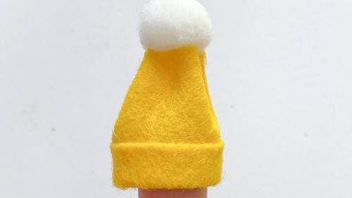 Für eine Mütze schneidet ihr wieder ein Rechteck aus Filz aus und klebt die untere Kante nach oben fest. Jetzt klebt ihr die beiden offenen Kanten hinten aufeinander und bekommt so einen Zylinder. Jetzt legt ihr den oberen Teil ein wenig in Falten und klebt einen Pompom auf die Spitze.