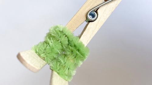Für lange Haare wickelt ihr Wolle um eure Finger und bindet eine Seite mit einem weiteren Faden ab und verknotet ihn. Klebt die Frisur nun seitlich an die Wäscheklammer. Um die Haare hinter dem Kopf zusammen zu halten, haben wir einfach ein Stück Pfeifenreiniger genommen.